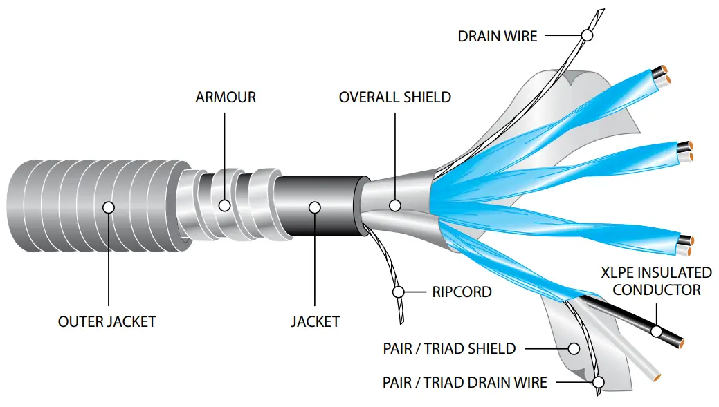 - type 2 armoured single and multi-pairs, pe/xlpe, overall screened or individual and overall screened, pvc outer sheath